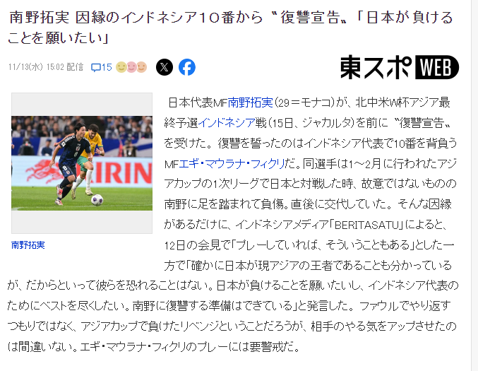 对于维克里放出的狠话,日本媒体表示,无论是维克里想帮助印尼队取胜复仇,还是想用犯规来回击,日本球员都要小心对手的拼劲,尤其维克里登场,一定要警惕对手的动作。
